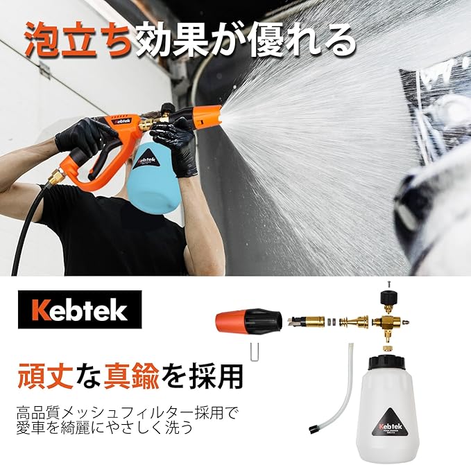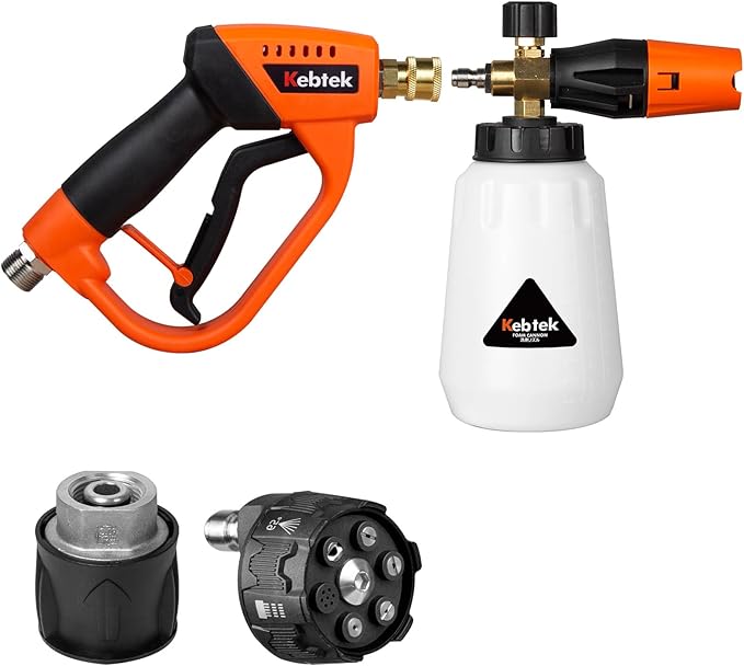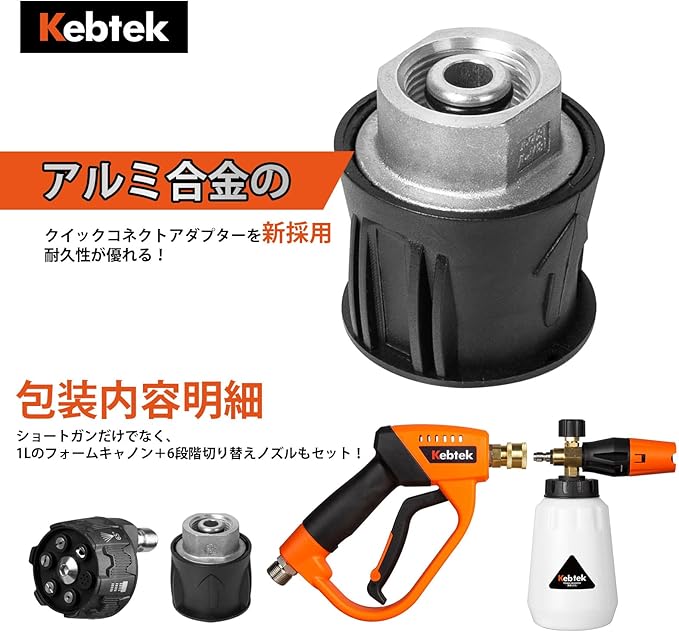 【泡洗車と水洗車セット・ケルヒャー対応】Kebtek 高圧洗浄ショートガン 6in1洗車 あんぜんロック機能付き フォームガン 泡 洗車 泡濃さ調整可能 M22 14mm真ちゅう製 クイックコネクタ ワンタッチ式 KarcherKシリーズ対応 圧力5200PSI 洗床用 掃除用 (ショートガン+1Lフォームキャノン+6in1ノズル+クイックコネクタアダプター)