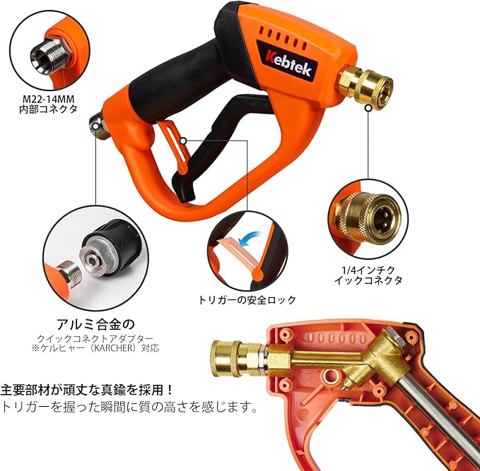 【泡洗車と水洗車セット&ケルヒャークイックコネクト対応】:この高圧洗浄機ショートガンはアルミ合金のクイックコネクトアダプターを新しく採用されました。付属されたM22-14mmめねじコネクタはケルヒャーKシリーズのクイックコネクトホースに対応できます。ワンタッチで接続できます。洗車が快適になります。クイックコネクト採用前の古い機種のピンタイプ・ネジ式には使用不可。OC3、KHB5、業務用HDシリーズは使用不可。