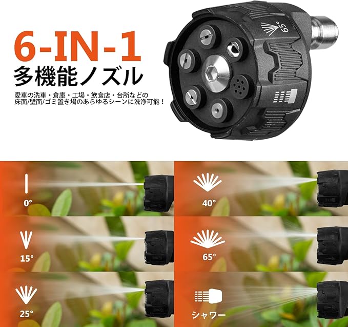 【6in1ノズル&泡濃さと水圧調整可】:この高圧洗浄ショートガンは6in1ノズルを採用しています。0 、15 、25 、40 、65 、シャワーが1つのノズルに集約されています。6in1なので、ノズルを交換する必要がなく、ニーズに応じて適切なスプレーモードを切り替えられます。調整ノブで泡の濃さを好きに調整できます。愛車を丁寧にかつ綺麗にやさしく洗うことができます。