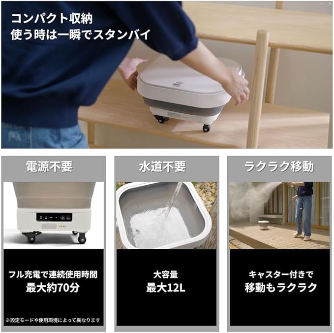 【水道&コンセント不要】自給式&コードレス仕様で場所を選ばず使用可能。キャンプやアウトドアでも活躍し、電源や水道のない環境でも汚れを落とせる便利な高圧洗浄機。