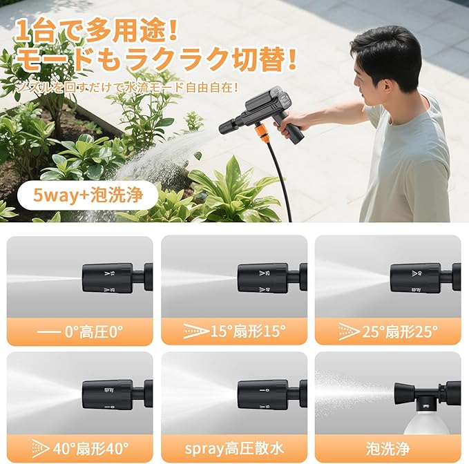 ✨ 【5種ノズル+泡洗浄で、家族のあらゆる「洗う」を楽しむ】 0 (集中洗浄)、15 、25 、40 (広範囲洗浄)、SPRAY(優しい水霧)の5段階噴射モードに加え、専用タンクに洗剤を入れると泡を噴射可能。さらに汚れを落としやすく。洗車、庭木への水やり、窓掃除、そしてリラクゼーションシャワーまで、一台で多彩なニーズにお応えします。