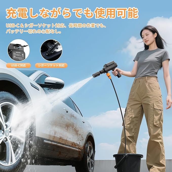【業界革新!充電しながら使用可能!大容量12000mAhでアウトドアも安心の無限駆動】12000mAhバッテリー単体でも最大30分連続使用可能なので、お庭の水やりから愛車の洗車まで、バッテリー切れの心配無用です。他にはない「充電しながら使用可能」機能で、家庭のコンセントはもちろん、キャンプやドライブ先では車のシガーソケットから即充電。