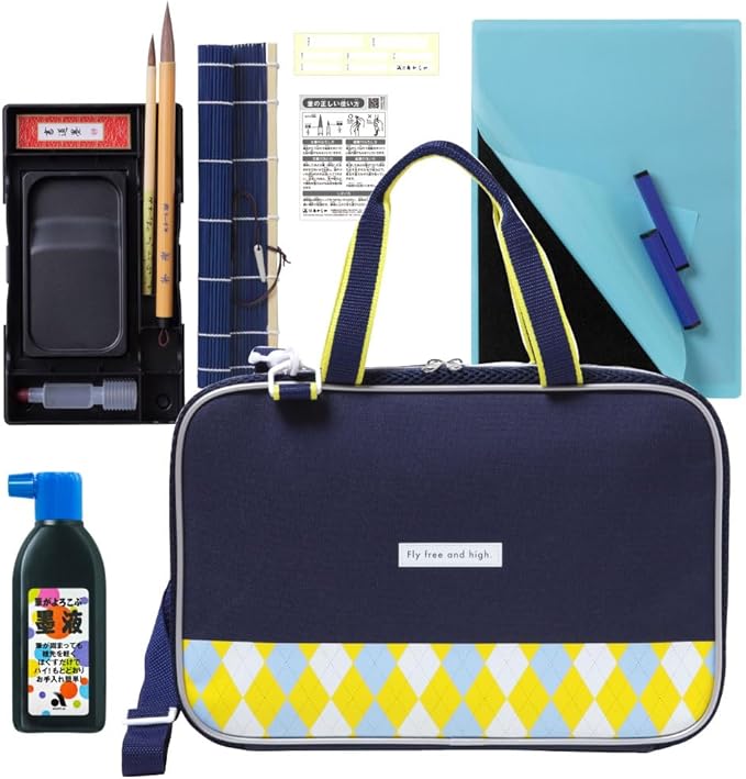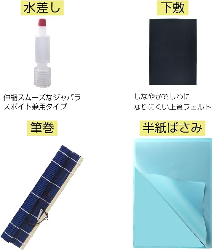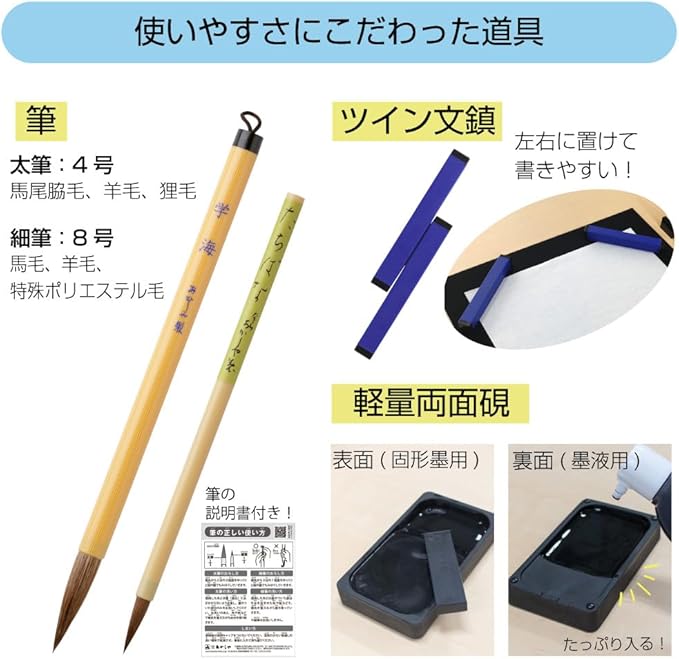 太筆、細筆、固形墨、墨液(180mL)、軽量両面硯(表面:硯、裏面:墨池)、ラバーツイン文鎮(185g)、下敷、半紙ばさみ、筆巻、スポイト式水差し、書道具収納ケース、筆置き、筆の説明書、ショルダーベルト