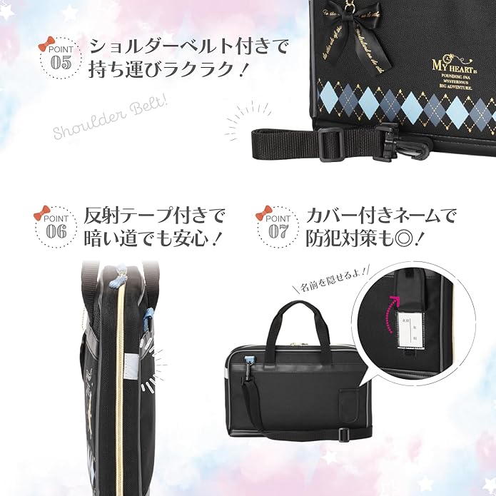 両サイドに光を反射するテープ付きで夜道でも安心です。