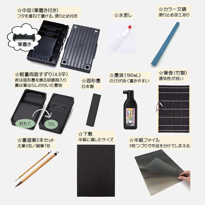 【セット内容】筆(太・細2本組)/墨液/軽量硯(樹脂)/下敷/中皿/半紙ファイル/水差/文鎮/固形墨/筆巻/筆置き