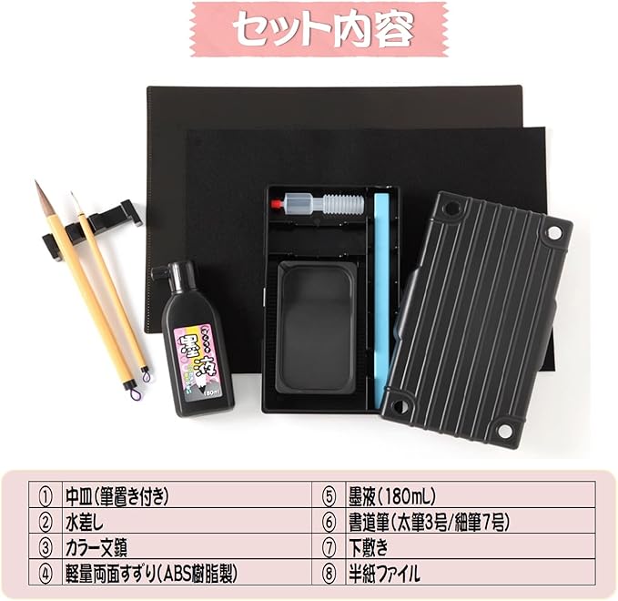 【セット内容】筆(太・細2本組)/墨液/軽量硯/下敷/中皿/半紙ファイル/水差/文鎮/筆置き