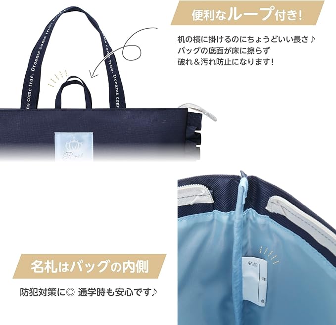 A4サイズが入ってレッスンバッグとしても使えるトートタイプ。机などのフックに掛けられるループ付き。