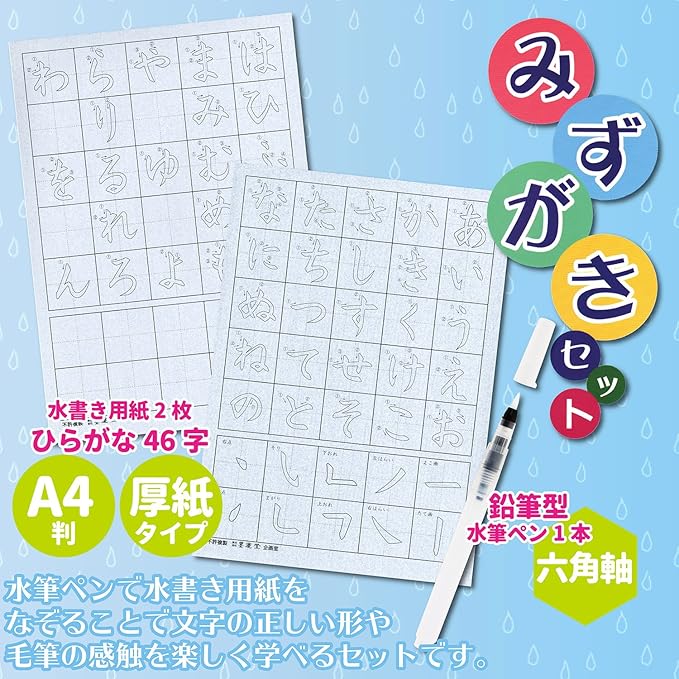 【セット内容】A4判水書き用紙(厚紙タイプ) 2枚、鉛筆型水書き用水筆ペン 1本