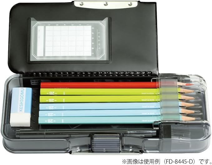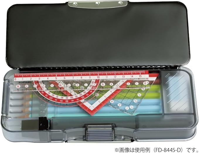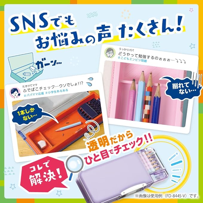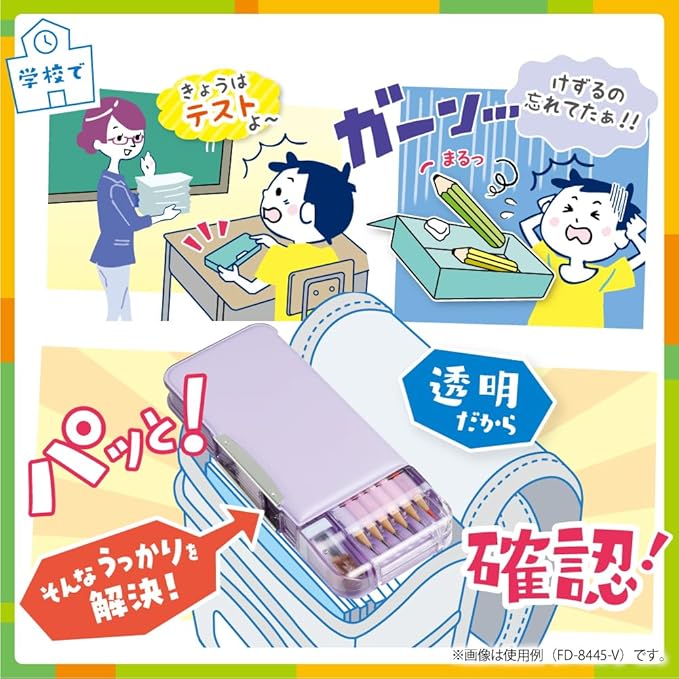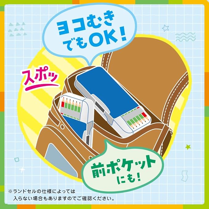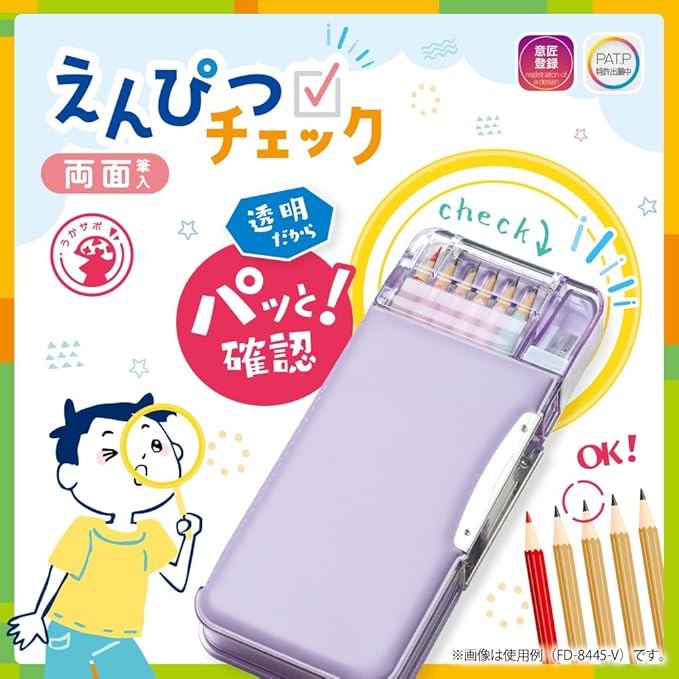 うっかり「鉛筆を削り忘れちゃった!」問題をサポートする、えんぴつチェック両面筆入 フタを開けずに鉛筆の先端が見えるのでチェックらくチン! シリコン製の鉛筆ホルダーで、走ってもしっかり鉛筆をホールド 付属の鉛筆削りも外から削りカスが見えるので「うっかり捨て忘れ」も防ぎます。 ランドセルへは横向きにも、前ポケットにも、空いたスペースに入ります。 鉛筆の削り忘れ、入れ忘れ…そんなうっかりを解決!こどものうっかりをサポートする「えんぴつチェック両面筆入」 フタを開けずに、外側から鉛筆の芯先が見える設計だから、閉じたままでも鉛筆の有無や削り忘れのチェックができる。 シリコン製の鉛筆ホルダーで、軽く差し込むだけで、走って揺れてもしっかり鉛筆をホールド! 最薄クラスのスリムボディーでランドセルへは横向きにも、前ポケットにも、スキ間へスッキリ収納!しかも頑丈! 裂けに強いメッシュ+PVCの2層構造「Wシート補強」で開閉耐久UP! 授業のことを考えて、鉛筆は5教科分+赤鉛筆の合計6本収納できるペンホルダー。 大容量、小学校の標準的な筆入の中身の持ち物リストに対応。 外から削りカスが見えるので「うっかり捨て忘れ」も防ぎ、取り外しができる鉛筆削り付。 直線定規15cm、三角定規13cm、分度器1cmといった大き目サイズの三角定規も収納可能。 シンプルデザインの無地タイプ(華美なデザイン禁止の学校でも使いやすい)