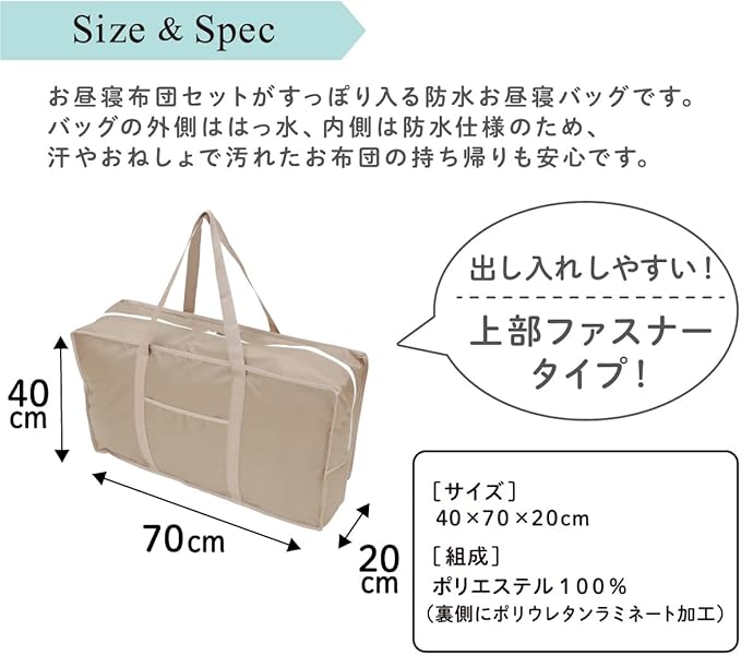【上部ファスナー式】お昼寝布団セットがすっぽりと入ります。さらにハンカチ等の小物を入れることができる両面ポケット付き。