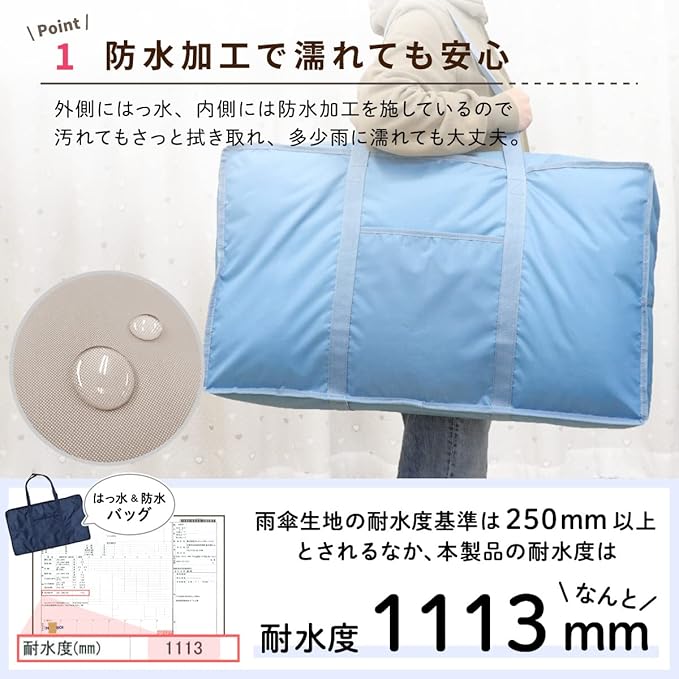 はっ水&防水仕様のお昼寝布団用バッグ内側に防水加工を施しているため、汗やおねしょで濡れたものでも安心して持ち帰ることができます。さらに外側がはっ水加工のため、汚れてもさっと拭き取れ、雨に濡れても大丈夫。