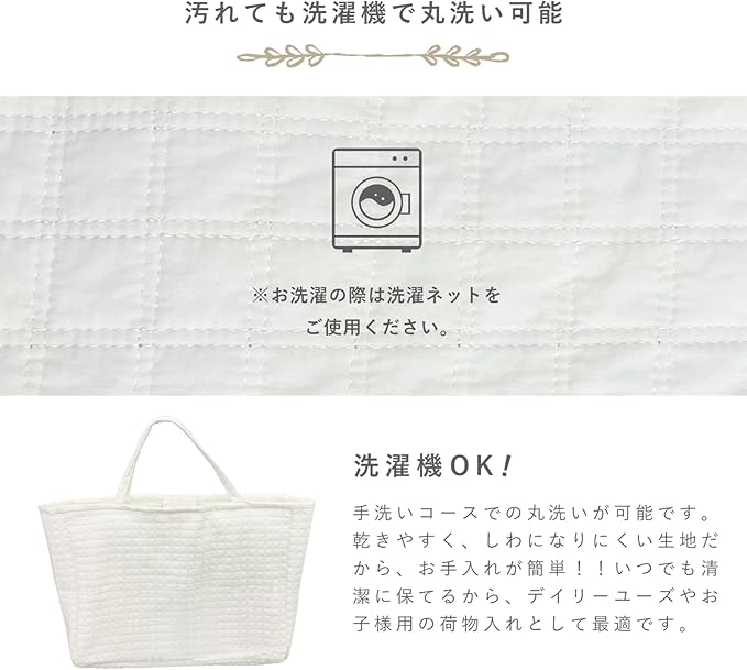 【洗濯機OK】 手洗いコースでの丸洗いが可能です。乾きやすく、しわになりにくい生地だからお手入れ簡単。いつでも清潔に保てるからデイリーユーズやお子様の荷物入れとして最適です。