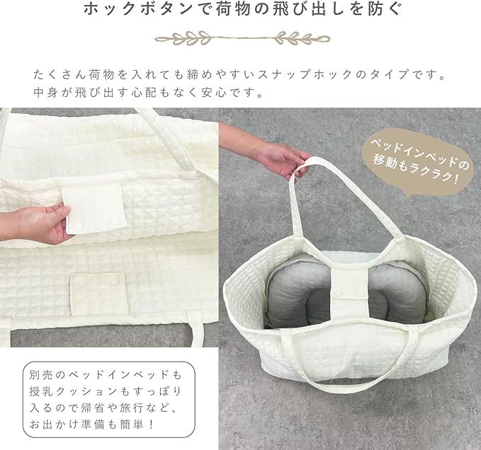 里帰りの持ち物にちょうどいい大型キルトバッグのお昼寝布団バッグ 【たくさんの荷物が楽々収納可能】 大きく口が開くので、ベビーグッズなどの物の出し入れもスムーズです。たくさん荷物を入れても締めやすいスナップホックタイプで、中身が飛び出す心配もありません。マザーズバッグとしても帰省や旅行にぴったり。ベットインベット(別売)がすっぽり入る大容量のバックです。ベットインベットを入れてもまだ余裕がある為お子様の荷物が1つにまとめて頂けます。