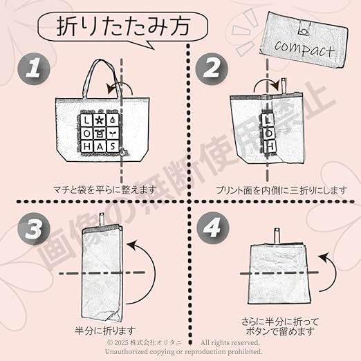 【大きいサイズ】W640xH450xマチ150mm(肩紐660mm) ※多少の誤差はご容赦ください。 使用時はポケットにホックが付いています。 未使用時は、約、縦12cm、横21cmのコンパクトサイズにたたんで ホックで留められます。