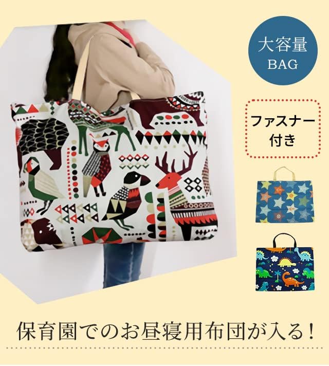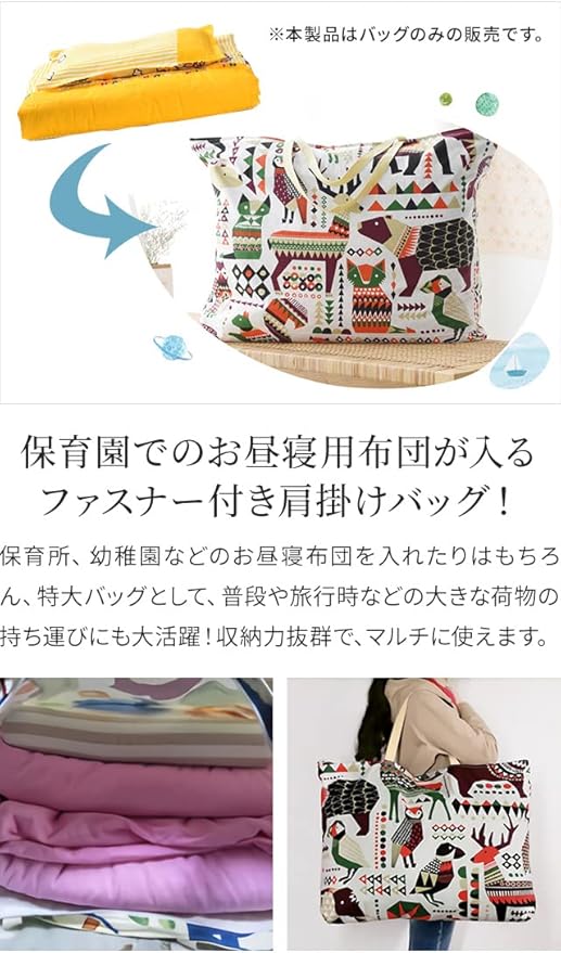 保育園で使うお昼寝用の布団が入るファスナー付き肩掛けバッグ!畳んでコンパクトに持ち運びできます。バッグのみをお求めの方に。ファスナータイプですので、開け閉め簡単!保育所、幼稚園などのお昼寝布団を入れたりはもちろん、特大バッグとして、普段や旅行時などの大きな荷物の持ち運びにも大活躍!収納力抜群で、マルチに使えます。