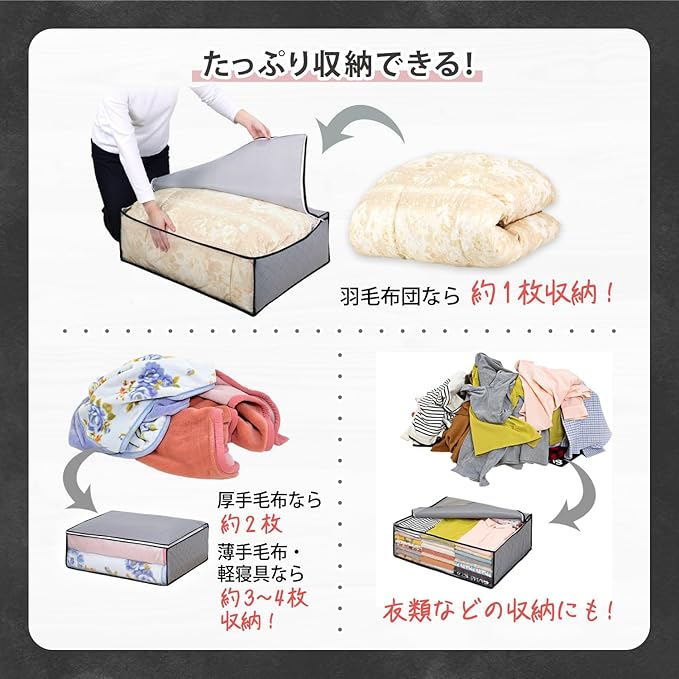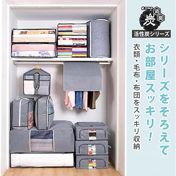 ●活性炭のチカラで消臭保管。活性炭シートがにおいをしっかり消臭。静電気が発生しやすくホコリが付着しがちな毛布や軽寝具などをにおい・ホコリ・汚れからしっかり守る。