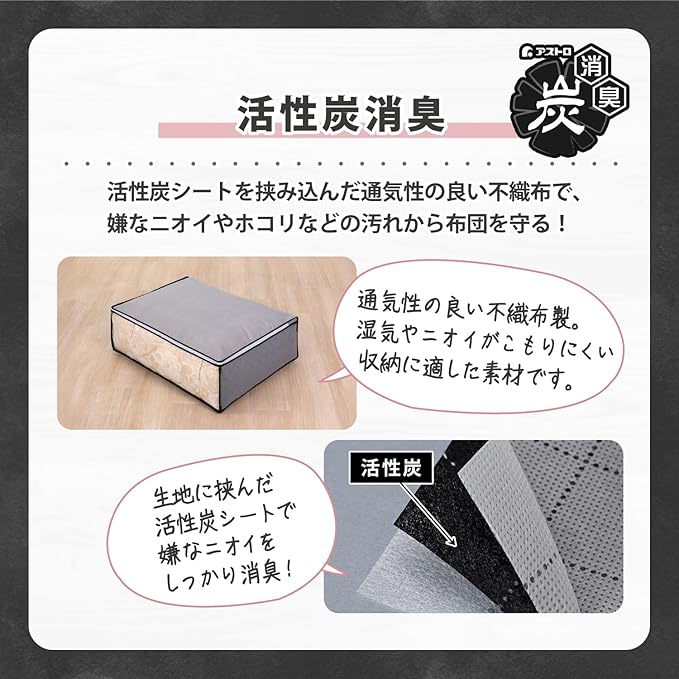 アストロ 活性炭消臭 布団収納ケース 毛布 軽寝具用 2枚組 活性炭のチカラで消臭保管 通気性の良い不織布がホコリなどの汚れをガード 3層構造の厚手でしっかりとした生地 透明窓付き 布団収納 布団袋 引っ越し グレー 171-02