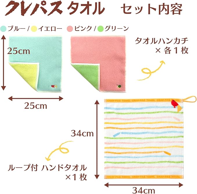 スタイレム瀧定大阪(Stylem Takisada-Osaka) サクラクレパス タオル ギフト 箱入り ハンドタオル 保育園 ループ付 1枚 34 34cm タオルハンカチ 2枚 25 25cm 綿100% 幼稚園 入園祝い かわいい 男の子 女の子 リバーシブル CR23150