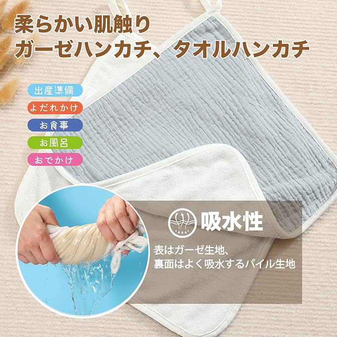 子育てが楽になるガーゼタオル。ハンカチ、赤ちゃんのガーゼタオル、よだれかけ、ベビービブとしては大活躍。特に保育園や幼稚園での使用に便利なデザインが特徴です。