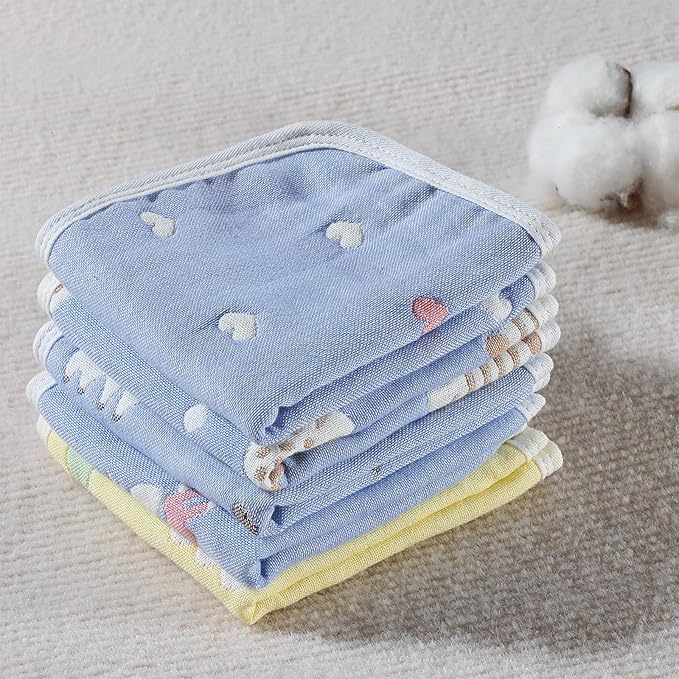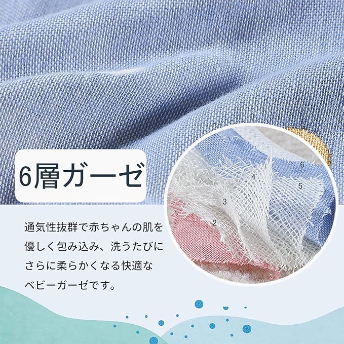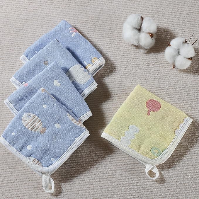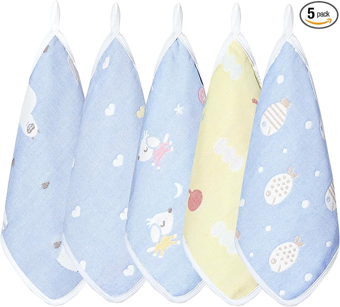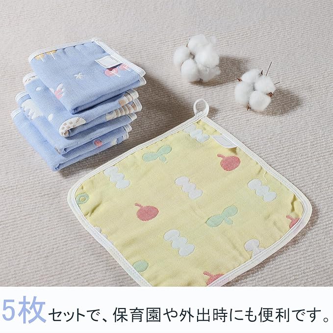 [HOOMCOOM] ガーゼハンカチ ベビー 6層 ガーゼタオル 赤ちゃん ループ付き 名前を書ける 保育園用 綿100% 25x25cm 5枚セット ブルー