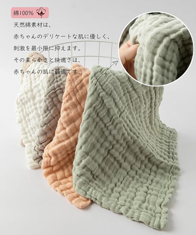 ガーゼタオルの特徴:吸水抜群、速乾、洗うほど柔らかくなり、硬くなりません。