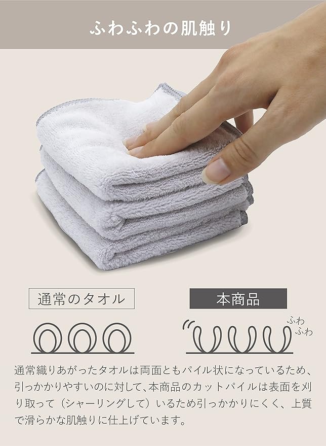 ふわふわ肌触りの秘密は、独自のカットパイル仕上げ。表面を刈り取ることによって、上質な肌触りになっています。また、繊維の隙間で吸水する一方、通気性も良い繊維なので速乾性にも優れています。