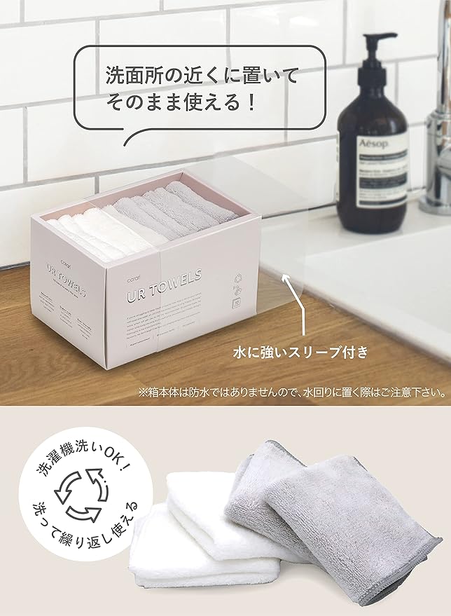 洗面所などに置いておけばペーパータオルのような感覚で使えます。もちろんタオルなので洗って何度も使用OK!環境にもお財布にも優しいタオルセットです。