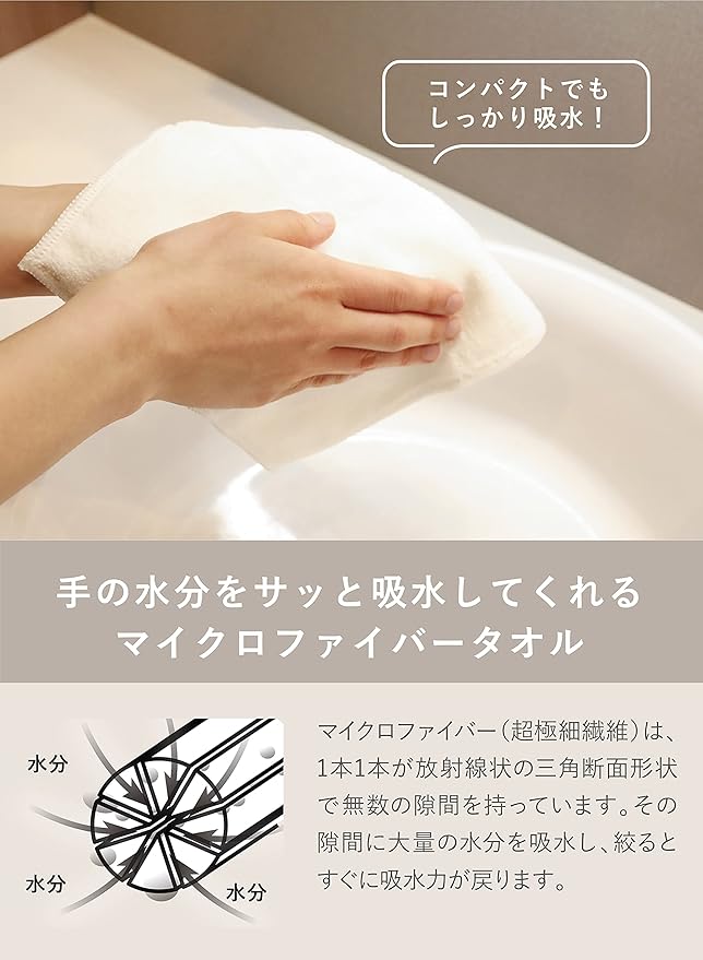 小さめサイズですが、マイクロファイバータオルなので吸水性は抜群。1枚でしっかりと両手の水分を拭き取ることが出来ます。