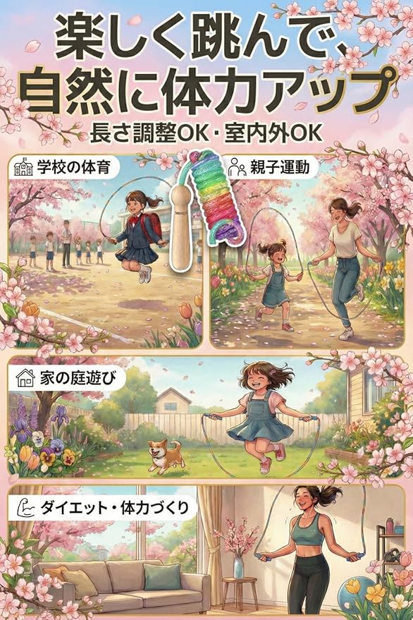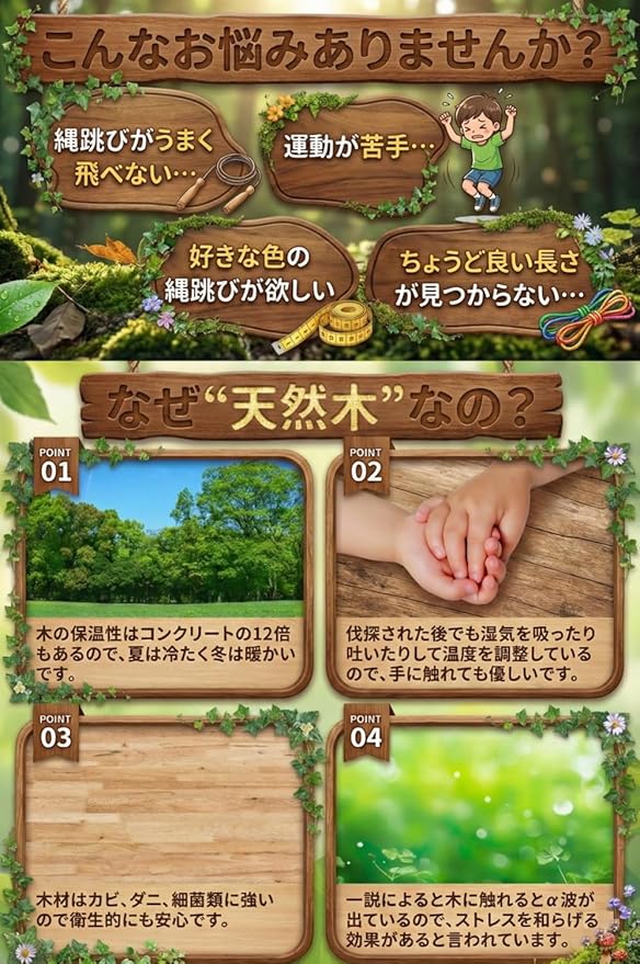 【上質仕上げ天然木デザイン】 縄跳び 子供用 幼児用 小学校 保育園 なわとび教室 ロープ長さ調整可 かわいい木製デザイン【HOT30日保証付き】