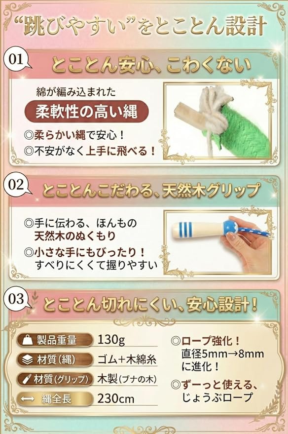 【天然木強化木製グリップ採用|耐久性 軽量性を両立】天然木を使用した【強化木製グリップ】を採用。 見た目の美しさだけでなく、耐久性が格段に向上し、破損リスクを最小限に抑えます。 さらに本体は約130gの軽量設計で、長時間の使用でも疲れにくい仕様に。 ──機能性とデザイン性を兼ね備えた、ワンランク上のジャンプロープです。