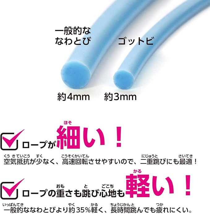 従来のなわとびよりロープが35%軽くなり跳びやすくなりました!(当社比)