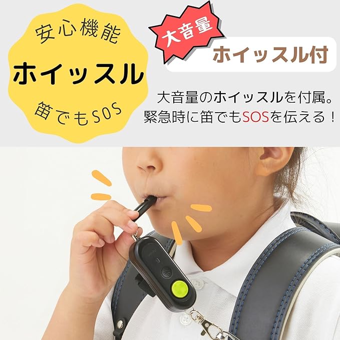 大音量で鳴るホイッスルがついた防犯ブザー。高レベルの防水防塵機能(IP64)。