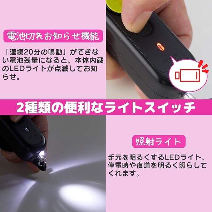 連続20分間の鳴動ができない電池残量になると、本体内蔵のLEDライトが点滅し、交換時期をお知らせ。