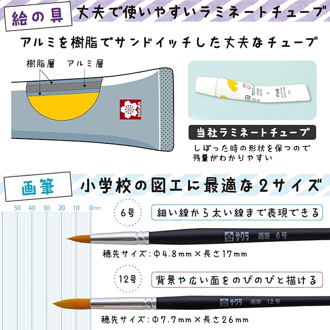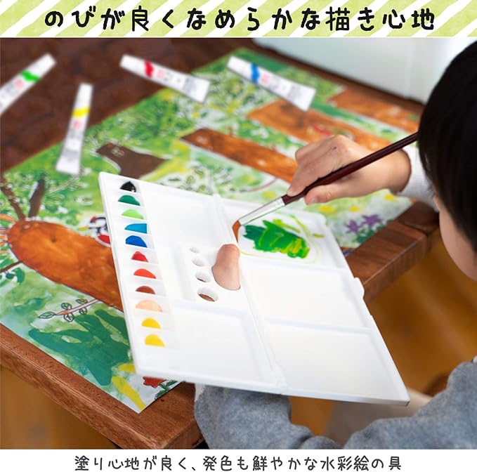 【セット内容】水彩絵の具12色(ラミネートチューブ入り)、画筆大(12号)・小(6号)各1本、筆筒、パレット、筆洗、筆ふきスポンジ