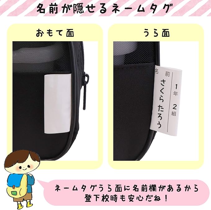 ネームタグの裏面に名前欄があり、登下校中に名前を隠すことができて安心。