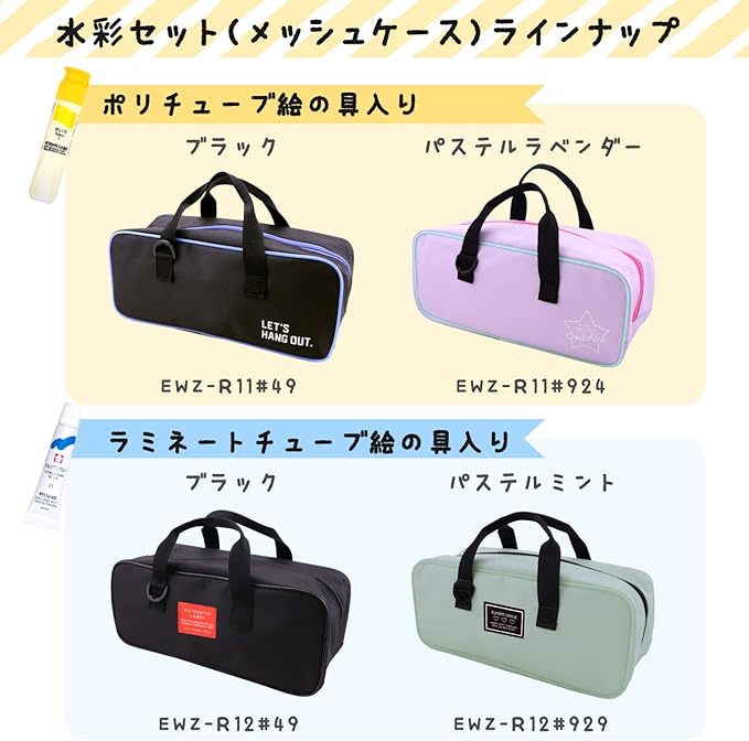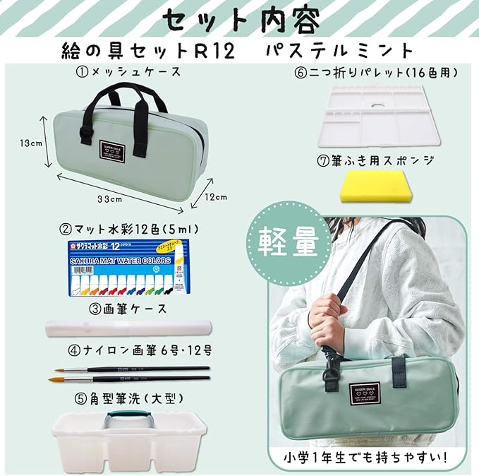 【特長】コンパクトなのに出入れ楽々ワイドオープン!通気性が良いメッシュバッグに入った水彩セット。長く使えるシンプルなデザイン。ネームタグの裏面に名前欄があるので登下校中名前を隠すことができる。