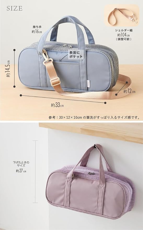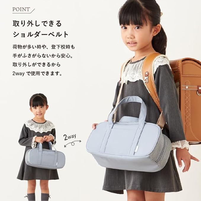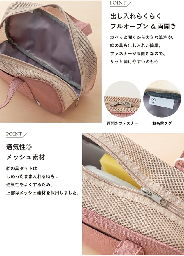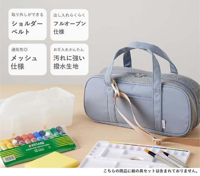 お子さまの創作活動を快適にサポートする絵の具バッグが登場! ショルダーベルトが取り外せる2WAY仕様 で、肩掛けと手持ちのどちらでも使えます。さらに、メッシュ仕様で通気性がよく、使用後の道具もムレにくく乾燥しやすいのが特長です。 開口部はフルオープン&両開きファスナーを採用し、絵の具や筆の出し入れがスムーズ。生地には撥水加工を施し、汚れに強い素材を使用しているため、長く清潔に使えます。