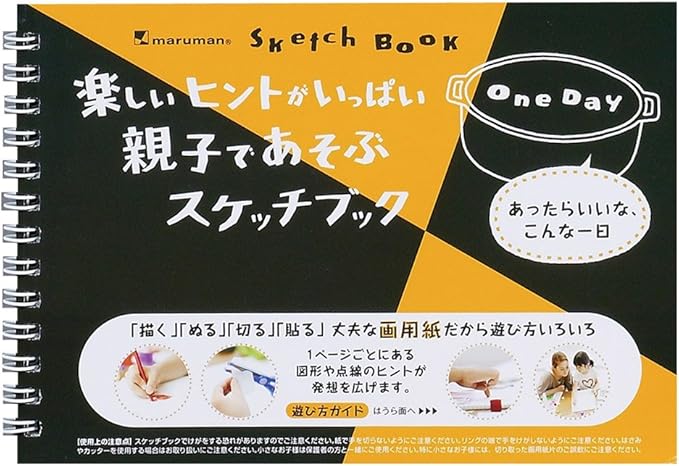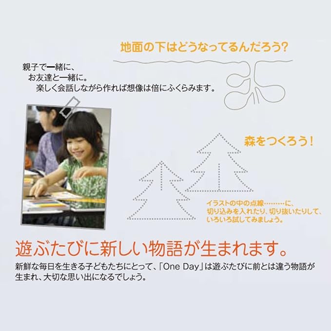 アマチュアからプロまで、あらゆるユーザーに愛されている図案スケッチブックに、親子で楽しめる「One Day」が登場。各ページには、ある一日の出来事をイメージしたシンプルなイラストが印刷されており、図形や点線をてがかりに「見立て」をしながら、色を塗ったり、絵を描き足したり、シールや紙を貼ったりと、自由な発想で遊ぶことができる。一緒に会話しながら遊べば、コミュニケーションの促進にも。 ※この商品は無地ではありません。