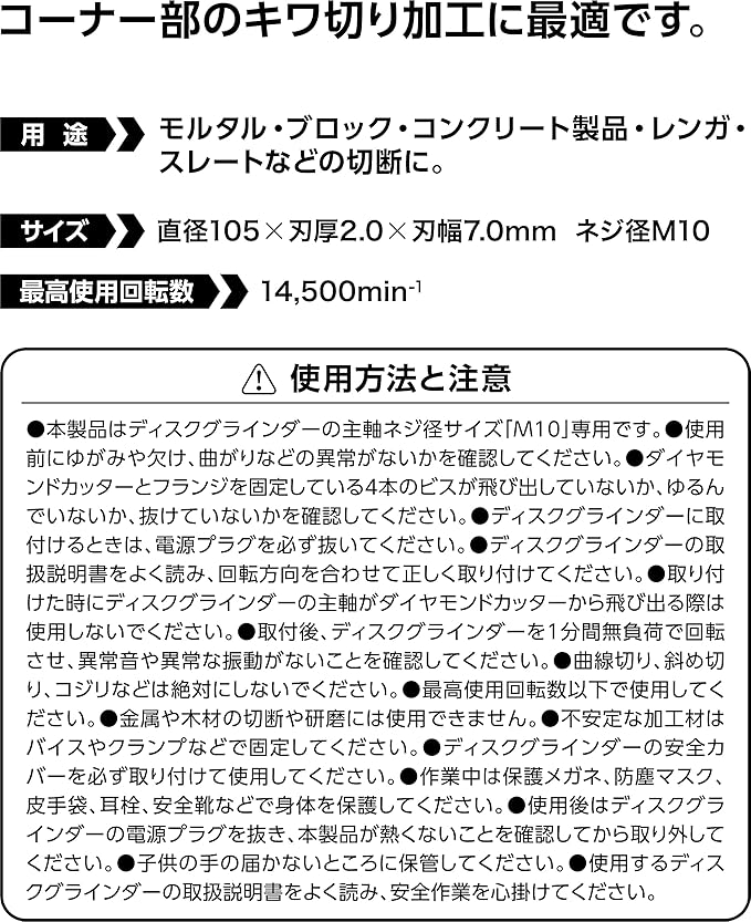 ■コーナー部のキワ切り加工に最適です。■直径:105 刃厚:2 刃幅:7 ネジ穴径:M10