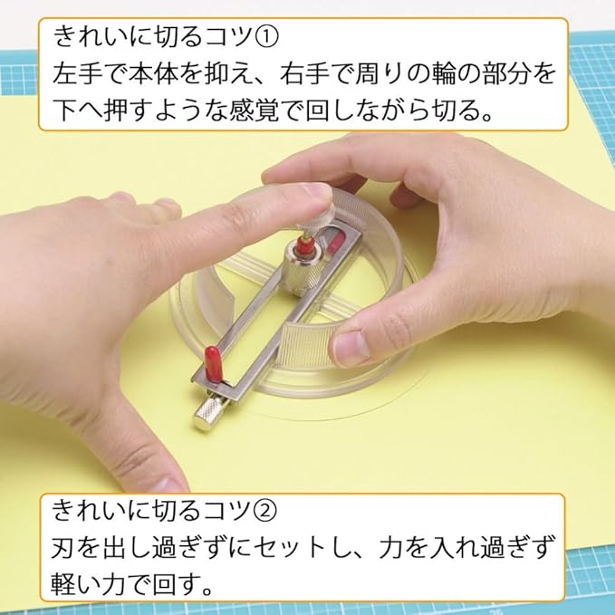 中心にピン穴を開けずに切れ、内封されているセンターゲージを使えば中心出しが簡単で、直径1.8~17cmの大きさを切り抜くことが可能。