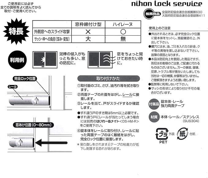 日本ロックサービス はいれーぬ サッシ用窓防犯錠 はいれーぬ鍵なし DS-H-25