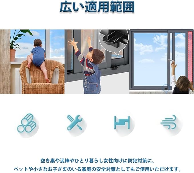 【広い適用範囲】空き巣や泥棒やひとり暮らし女性向けに防犯対策に、ペットや小さなお子さまのいる家庭の安全対策としてもご使用いただけます。