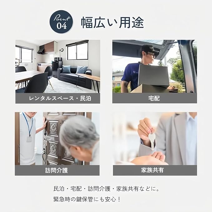 【幅広い用途】 民泊・宅配・訪問介護・家族共有などに。緊急時の鍵保管にも安心。