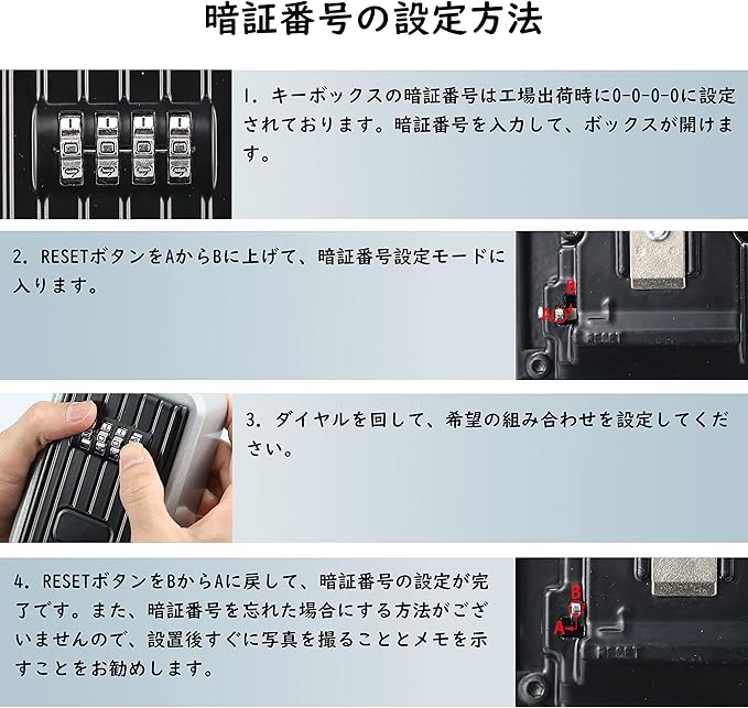 初期設置方法::1.ダイヤル盤を0-0-0-0に回してください。2.蓋を開け、 裏のリセットレバーをAからBに押してください。3.ダイヤル盤を好きな暗証番号に設定し、設定終わったらレバーを元の位置に戻して蓋を閉めます。4.最後は、新しい暗証番号でロックを開こうとします。
