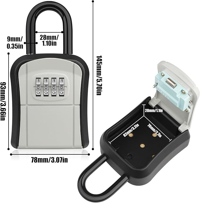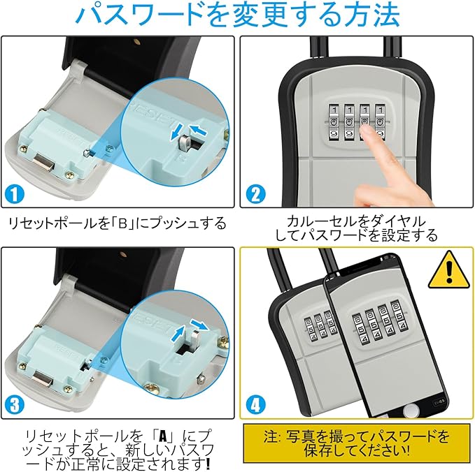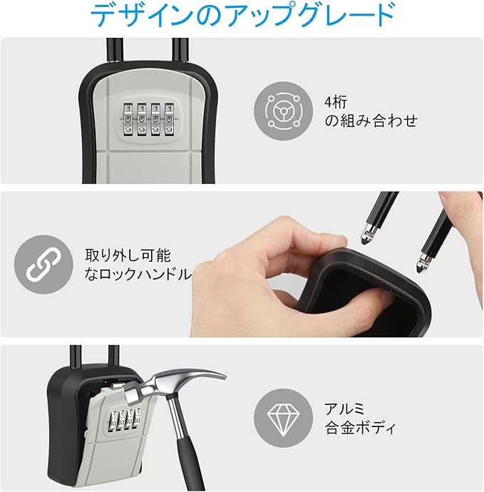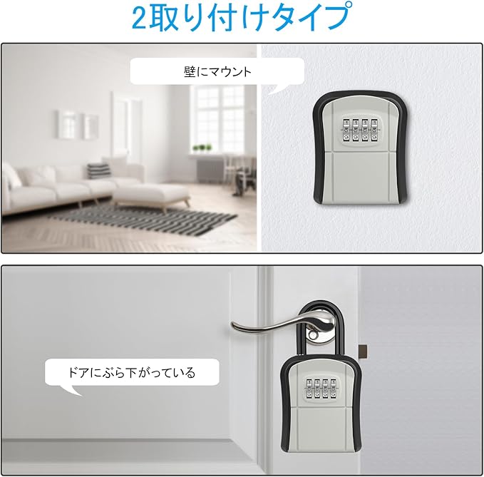 【吊り下げ&壁掛け設置】【吊り下げ】取り外し可能なシャックル付きキー金庫をドアノブ、フェンス、手すりなどに吊り下げるだけ-キー金庫を開ける時だけ開けることはできません-【壁掛け設置】1.箱を開けて、箱の背面に5つの穴があります。2.箱を壁に固定し、鉛筆で穴の位置に印をつけます。3.穴を開けます。4.プラスチックの拡張ネジを壁に取り付けます。5.ボックスを壁に当て、ねじ込みます
