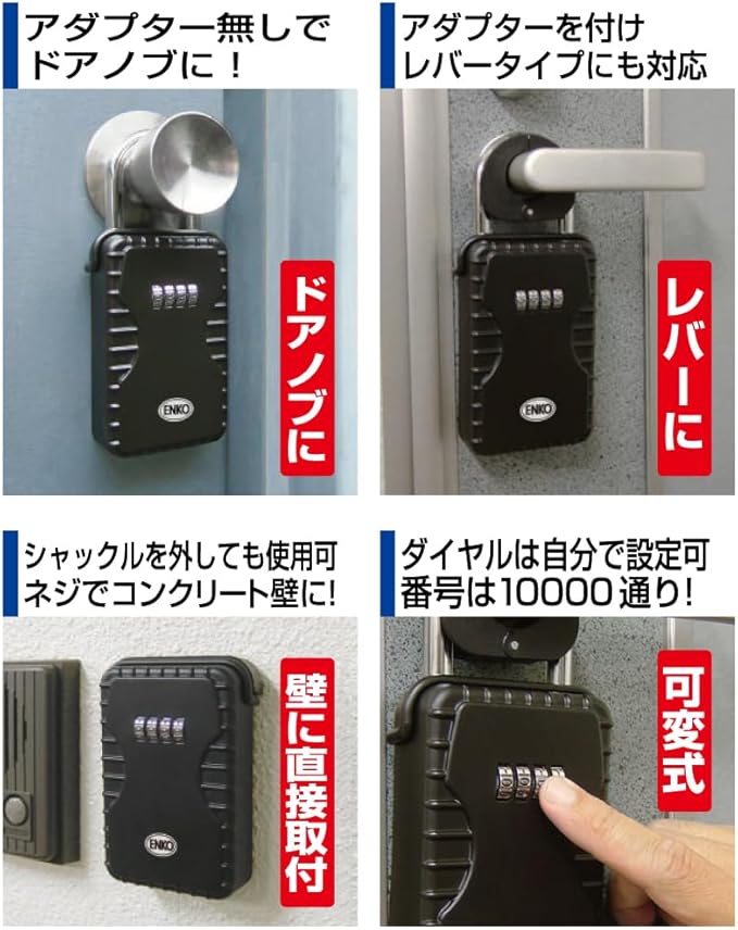 設置場所が「ドアノブ等に引っ掛けて」の取付と「壁にビス止め」との取付の2通りの方法を選べます。