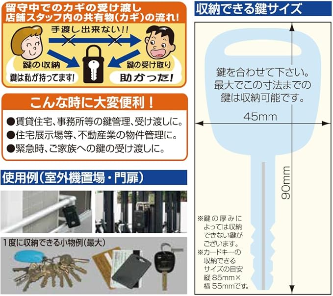 収納できる鍵サイズ:45x90mm※鍵の厚みによっては収納できない鍵がございます※カードキーの収納できるサイズの目安:85x55mm