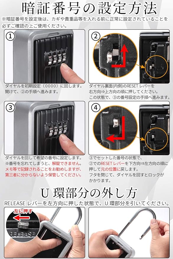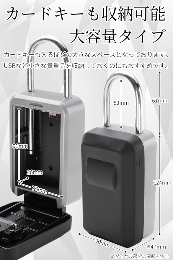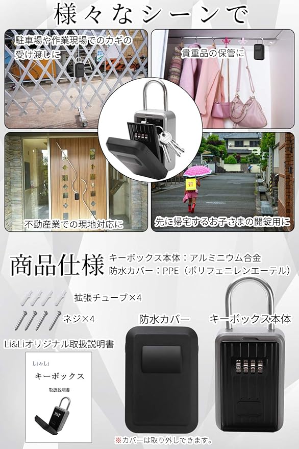 【商品詳細】 〈セット内容〉キーボックス本体・防水カバー・ネジ 4・拡張チューブ 4・Li&Liオリジナル取扱説明書 〈サイズ〉外部:約124 90mm、U環部:全長約61mm、内部:約91 77 26mm 〈素材〉キーボックス本体:アルミニウム合金、防水カバー:PPE(ポリフェニレンエーテル)