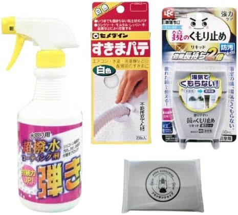 ●引っ越し時等に活躍する まとめセット ●水アカ・石鹸カス等の汚れを防止するのに、ティポス 超撥水剤 弾き! 本体スプレー ●洗面台、お風呂の鏡のくもり止めに、 激落ち 塗りやすい鏡のくもり止め リキッド 強力コート ●シンク下を防ぐ、セメダイン すきまパテ 白色 HC-146(200g)