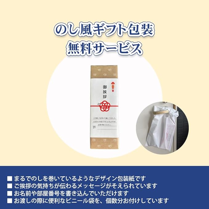 記入スペース付き: お名前やお部屋番号を記入できる熨斗紙デザインで、どなたからの贈り物かが一目で分かる仕様